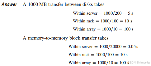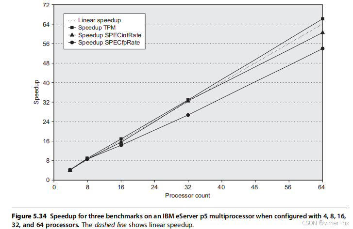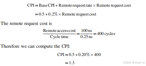 **例子** 假设我们有一个在32个处理器的多处理器上运行的应用程序,该应用程序处理对远程内存的引用时有100纳秒的延迟。对于该应用程序,假设除了涉及通信的引用外,所有引用都命中本地内存层级,这显然是乐观的。处理器在远程请求上会被阻塞,处理器的时钟频率为4 GHz。如果基准CPI(假设所有引用都在缓存中命中)为0.5,那么如果没有通信,与0.2%的指令涉及远程通信引用相比,多处理器的性能提升多少?
