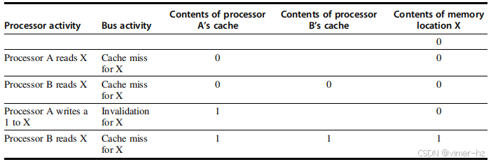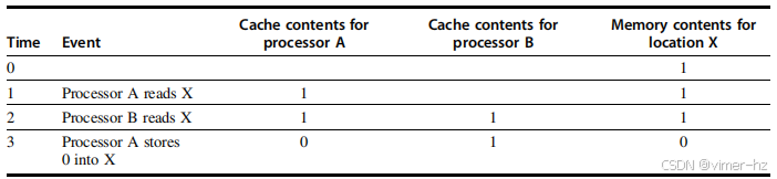图5.3 单个内存位置(X)的缓存一致性问题,由两个处理器(A和B)进行读写。我们最初假设两个缓存均不包含该变量,并且X的值为1。我们还假设使用的是直写缓存;而写回缓存则会增加一些额外但类似的复杂性。在A写入X的值后,A的缓存和内存都包含新值,但B的缓存不包含该值,如果B读取X的值,它将接收到1!