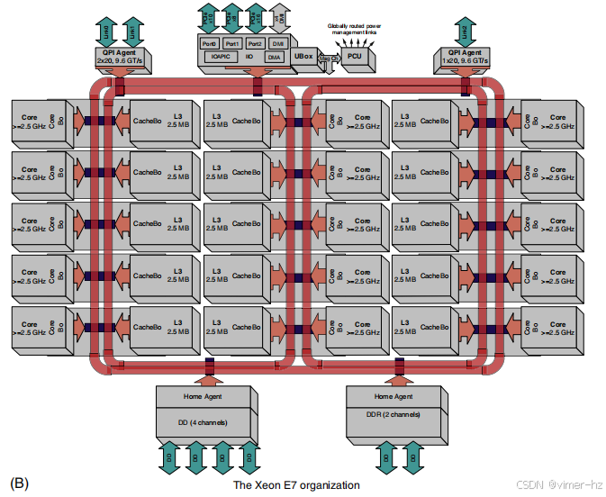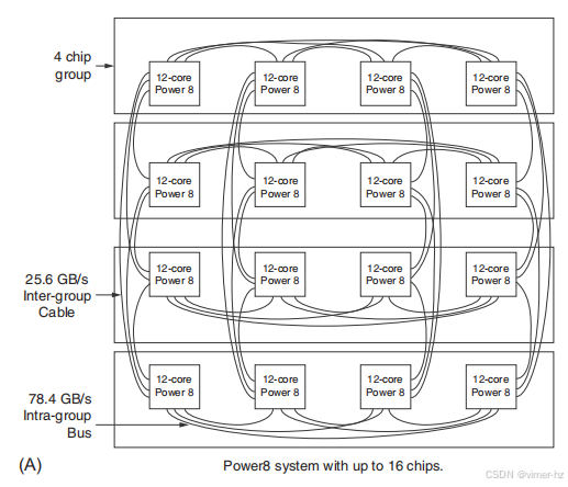 在由多个多核芯片组成的多处理器中,通常每个多核芯片都有独立的内存。因此,内存是分布式的,而不是集中式的。正如我们在本章后面将看到的,许多采用分布式内存的设计对本地内存的访问速度快,对远程内存的访问速度却要慢得多;通常,各个远程内存的访问时间差异相对于本地内存和远程内存的访问时间差异来说是微小的。在这种设计中,程序员和软件系统需要意识到访问是针对本地内存还是远程内存,但可能能够忽略远程内存之间访问的分布。