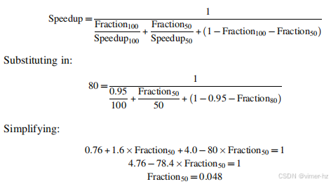 **例子** 假设我们有一个在100个处理器的多处理器上运行的应用程序,并且假设该应用程序可以使用1、50或100个处理器。如果我们假设在95%的时间内可以使用所有100个处理器,那么在剩余的5%执行时间中,必须使用多少个处理器才能实现80倍的加速?