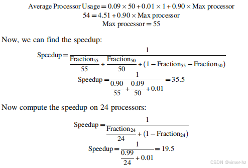 为了简化这个例子,假设程序仅在两种模式下运行:并行模式(所有处理器完全使用,即增强模式)和串行模式(仅使用一个处理器)。在这种简化情况下,增强模式下的加速简单地等于处理器的数量,而增强模式的比例则是花费在并行模式上的时间。将其代入前面的公式: