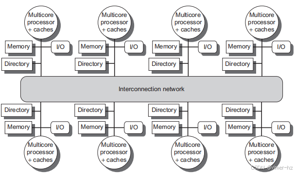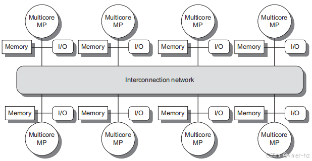 图5.2 2017年分布式内存多处理器的基本架构通常由一个多核多处理器芯片组成,该芯片附带内存和可能的I/O,以及一个与互连网络接口,连接所有节点。每个处理器核心共享整个内存,但连接到核心芯片的本地内存的访问时间将远快于对远程内存的访问时间。