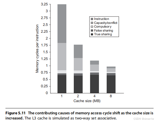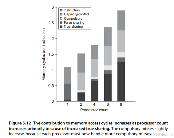 多处理器在所有本地引用的情况下比基准快1.3/0.5,即2.6倍。实际上,性能分析要复杂得多,因为一部分非通信引用会在本地层级中未命中,而远程访问时间也不是一个固定的常数。例如,远程引用的成本可能会更高,因为多个引用试图使用全局互连造成的竞争可能导致延迟增加,或者如果内存是分布式的并且访问的是本地内存,则访问时间可能会更好。这个问题也可以使用阿姆达尔定律进行分析,我们将这一练习留给读者。