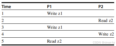 2. 处理器对位置X的读取跟随另一个处理器对X的写入时,如果读取与写入在时间上有足够的间隔,并且在这两个访问之间没有对X的其他写入,则返回已写入的值。