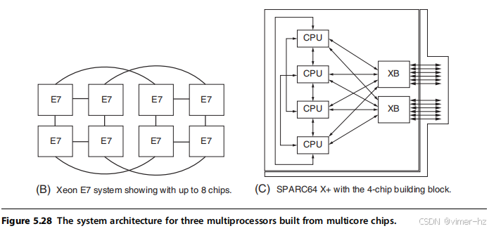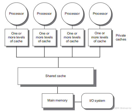 第一组我们称之为对称(共享内存)多处理器(SMPs),或集中式共享内存多处理器,通常具有小到中等数量的核心,通常不超过32个。对于处理器数量如此之少的多处理器,处理器可以共享一个所有处理器都能平等访问的单一集中式内存,因此称之为对称。在多核芯片中,内存通常在核心之间以集中方式共享;目前大多数现有的多核处理器都是SMP,但并非所有。(注意,有些文献错误地将SMP用作共享内存处理器的缩写,但这种用法是不正确的。)