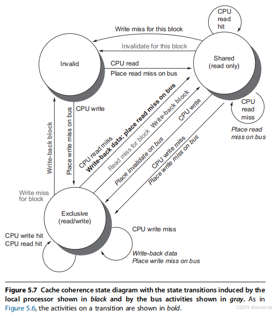 不幸的是,缓存共享数据引入了一个新问题。由于两个不同处理器对内存的视图是通过各自的缓存实现的,这些处理器可能会看到同一内存位置的不同值,如图5.3所示。这种困难通常被称为缓存一致性问题。注意,一致性问题的存在是因为我们同时拥有一个主要由主内存定义的全局状态和一个由每个处理器核心私有的各自缓存定义的局部状态。因此,在某个级别的缓存可能是共享的多核系统中(例如,L3),尽管某些级别是私有的(例如,L1和L2),一致性问题仍然存在并且必须解决。