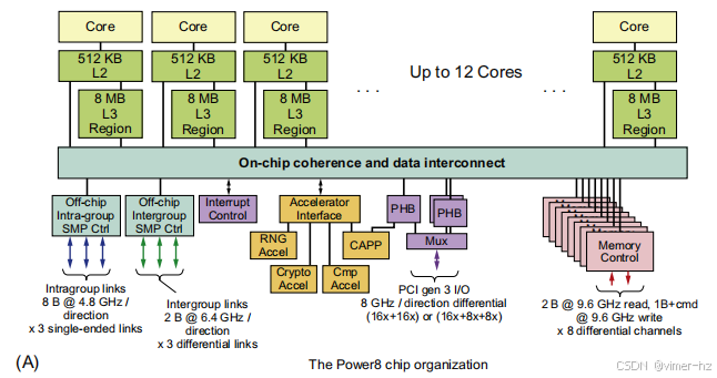使用大型多级缓存可以显著减少处理器的内存带宽需求,这一观察是驱动集中式内存多处理器发展的关键洞见。最初,这些处理器都是单核的,通常占据整个电路板,内存则位于共享总线上。随着最近更高性能处理器的出现,内存需求超出了合理总线的能力,现代微处理器直接将内存连接到单个芯片上,这有时被称为背面或内存总线,以区别于用于连接I/O的总线。访问芯片的本地内存,无论是针对I/O操作还是来自其他芯片的访问,都需要经过“拥有”该内存的芯片。因此,内存访问是不对称的:对本地内存的访问更快,而对远程内存的访问则较慢。在多核处理器中,这些内存在单个芯片上的所有核心之间共享,但从一个多核处理器访问另一个多核处理器的内存时,通常仍然存在这种不对称的情况。