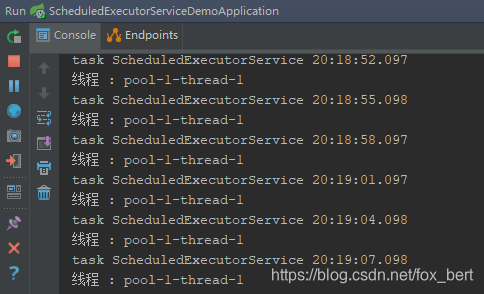 public class ScheduledExecutorServiceTimerTask {@Beanpublic void test(){ScheduledExecutorService service = Executors.newSingleThreadScheduledExecutor();// 参数:1、任务体 2、首次执行的延时时间// 3、任务执行间隔 4、间隔时间单位service.scheduleAtFixedRate(()->System.out.println("task ScheduledExecutorService "+ LocalDateTime.now().toLocalTime() + "\r\n线程 : " + Thread.currentThread().getName()), 0, 3, TimeUnit.SECONDS);}