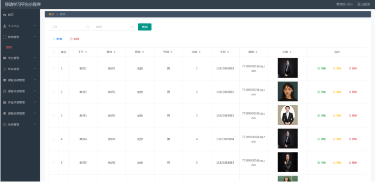 管理员进入指定功能操作区之后可以管理教师。其页面见下图。管理员增删改查教师信息,查看教师详情。