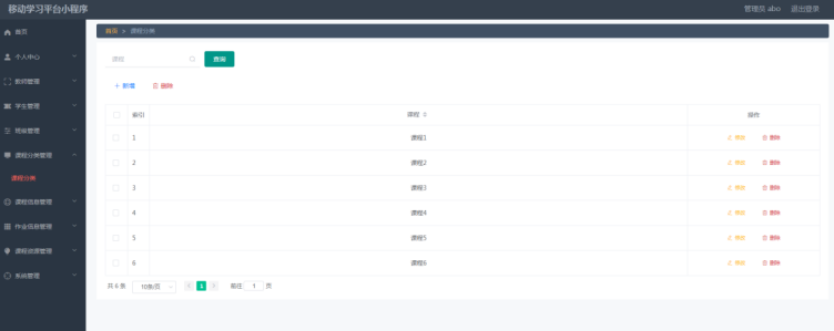 管理员进入指定功能操作区之后可以管理课程分类。其页面见下图。管理员增删改查课程分类信息。