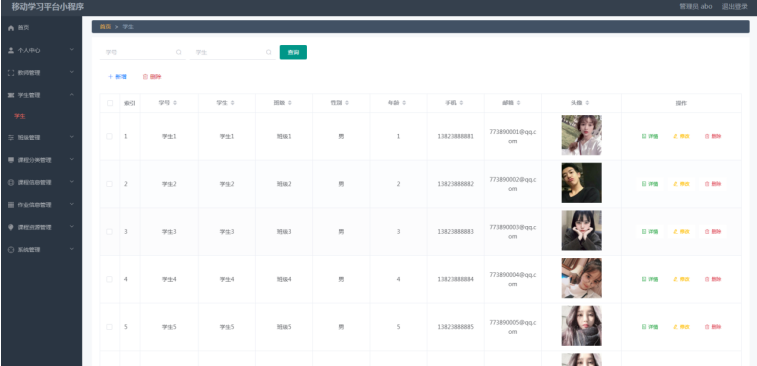 管理员进入指定功能操作区之后可以管理学生。其页面见下图。管理员增删改查学生信息,查看学生详情信息。