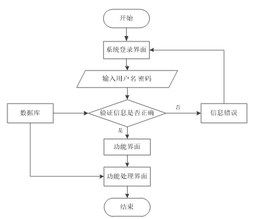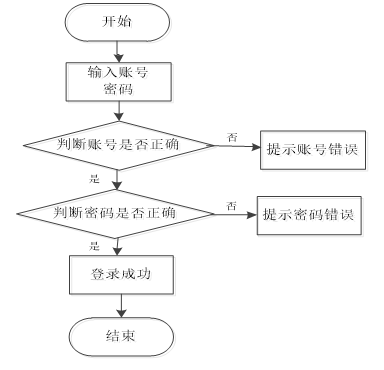 本系统的登录模块,其内部的流程见下图。主要对访问本系统的人员提供的验证信息进行逐个判断,系统面对录入错误的信息会给出提示,比如,提示账号不对,或提示密码不匹配等提示信息。总之,在登录页面填写的所有信息都符合要求,访问者就登录成功了。