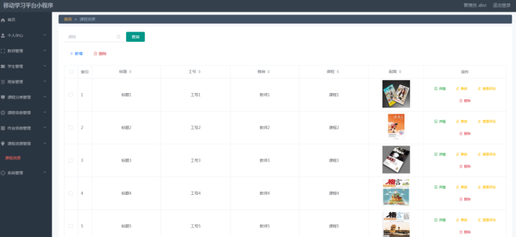 管理员进入指定功能操作区之后可以管理课程资源。其页面见下图。管理员增删改查课程资源信息,查看学生提交的课程资源评论信息。