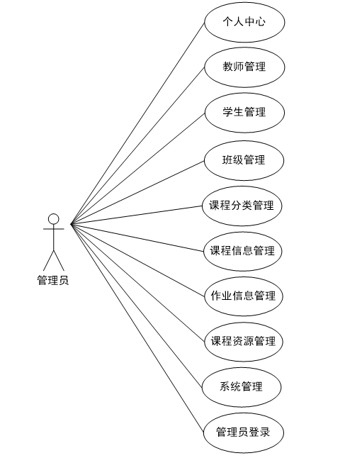 在前面分析的管理员功能的基础上,进行接下来的设计工作,最终展示设计的管理员结构图(见下图)。管理员对教师,课程分类,班级,课程,学生信息进行管理,审核学生作业,管理课程资源。