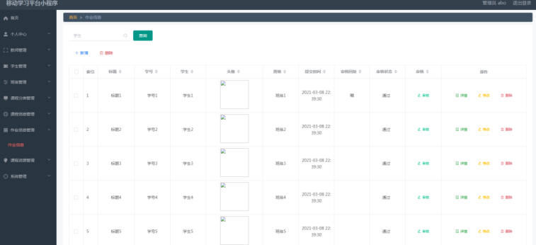 管理员进入指定功能操作区之后可以管理学生作业。其页面见下图。管理员增删改查学生作业,查看学生作业详情,审核学生的作业。