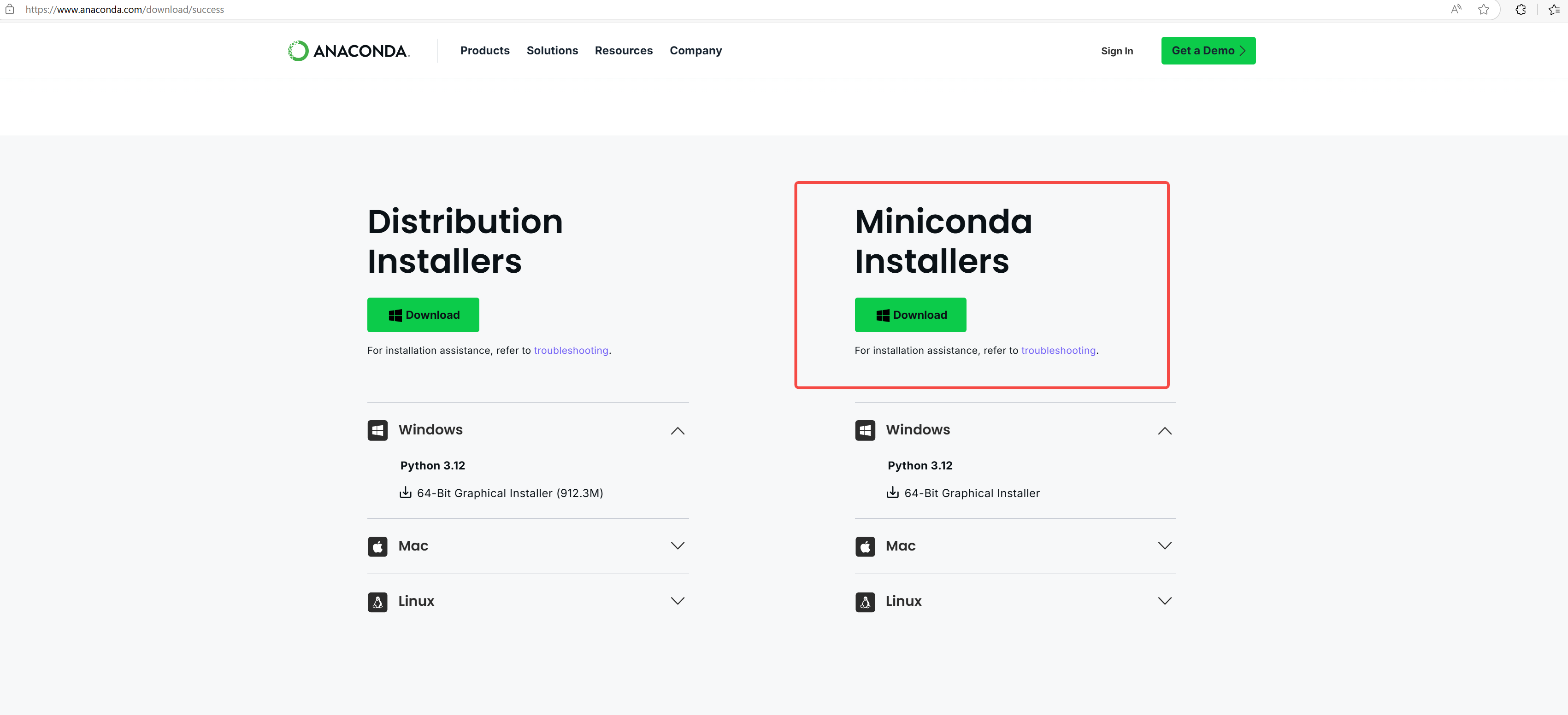 1. 访问 Anaconda官网 下载适合你操作系统的版本,这里建议选择 Mimiconda 安装。