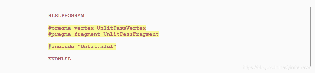 一个Shader至少应该包含vertex函数(顶点shader部分)和fragment函数(片元shader部分)。我们命名UnlitPassVertex for the vertex function and UnlitPassFragment for the other。但具体代码我们不在这个文件中实现,而是分离到一个单独的hlsl文件中,在这里include进来。