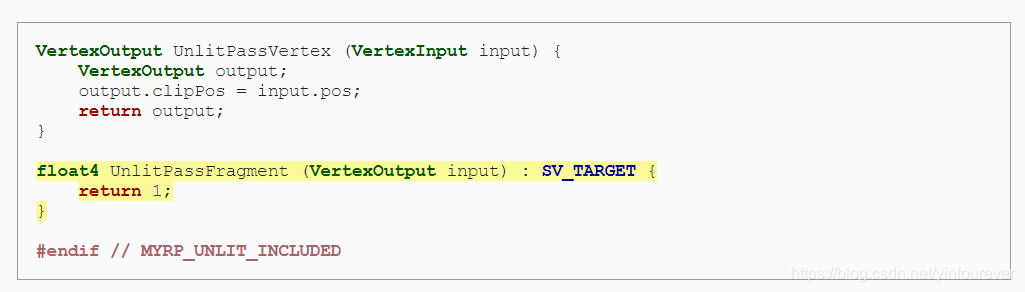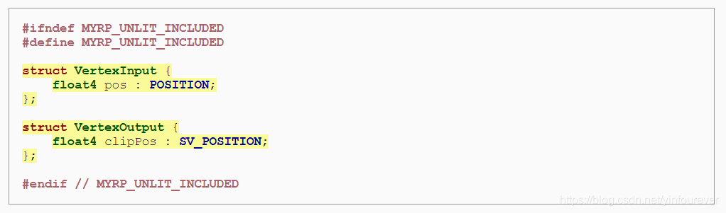 在生成的Unlit.hlsl文件中,我们使用#ifndef来避免多次引用。之后,我们声明Vertex函数的输入参数结构体和输出参数结构体