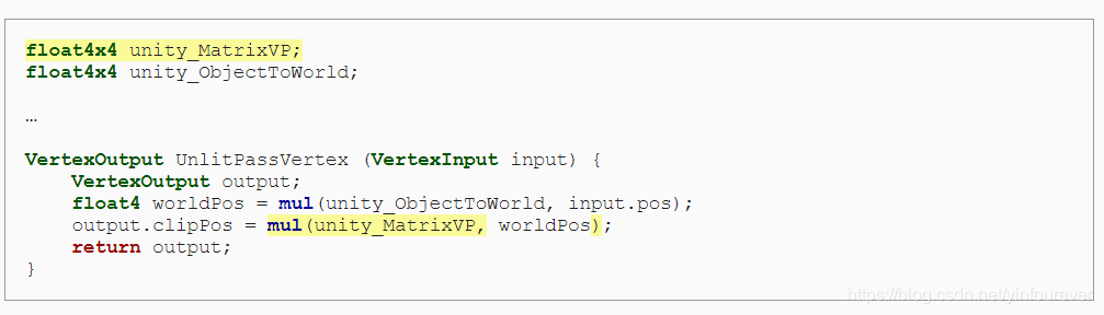 从模型空间到裁剪空间需要两步转换,我们先用unity_ObjectToWorld矩阵转换到世界坐标空间,再用unity_MatrixVP矩阵转换到裁剪空间。