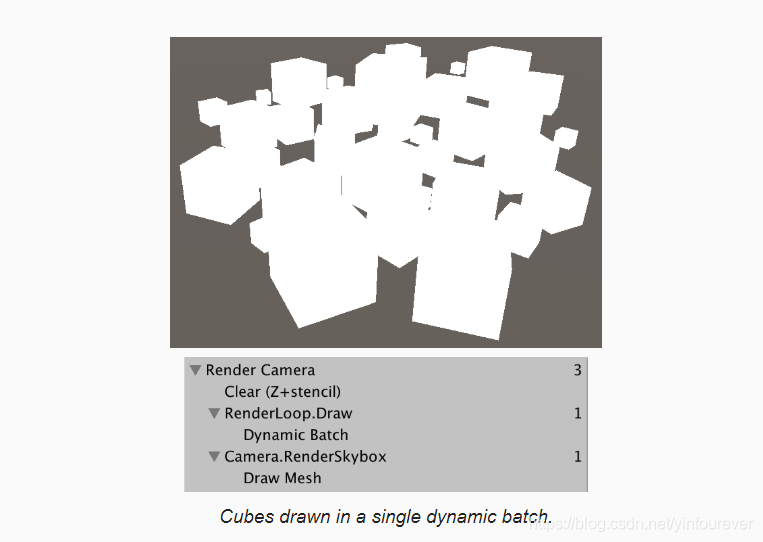 除了动态合批外,GPU Instancing也可以用于减少draw call。通过GPU Instancing,CPU告诉GPU在一个draw call中,渲染特定的mesh和material的组合多次。这使得使用相同mesh和material的物体渲染时不再像动态合批需要重新组成一个新的后批后的大mesh,这也就移除了对mesh大小的限制。
