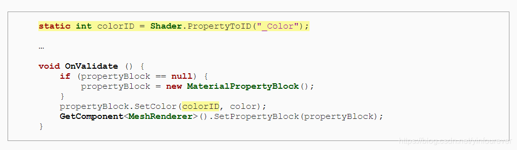 其次通过MaterialPropertyBlock函数创建一个MaterialPropertyBlock实体,通过它来设置material中的颜色。这些操作写入了OnValidate函数中,使得在editor中可以看到颜色变化效果。