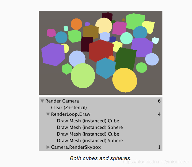 本章最后实现的效果如下图,多个不同颜色球体,只需要一个draw call