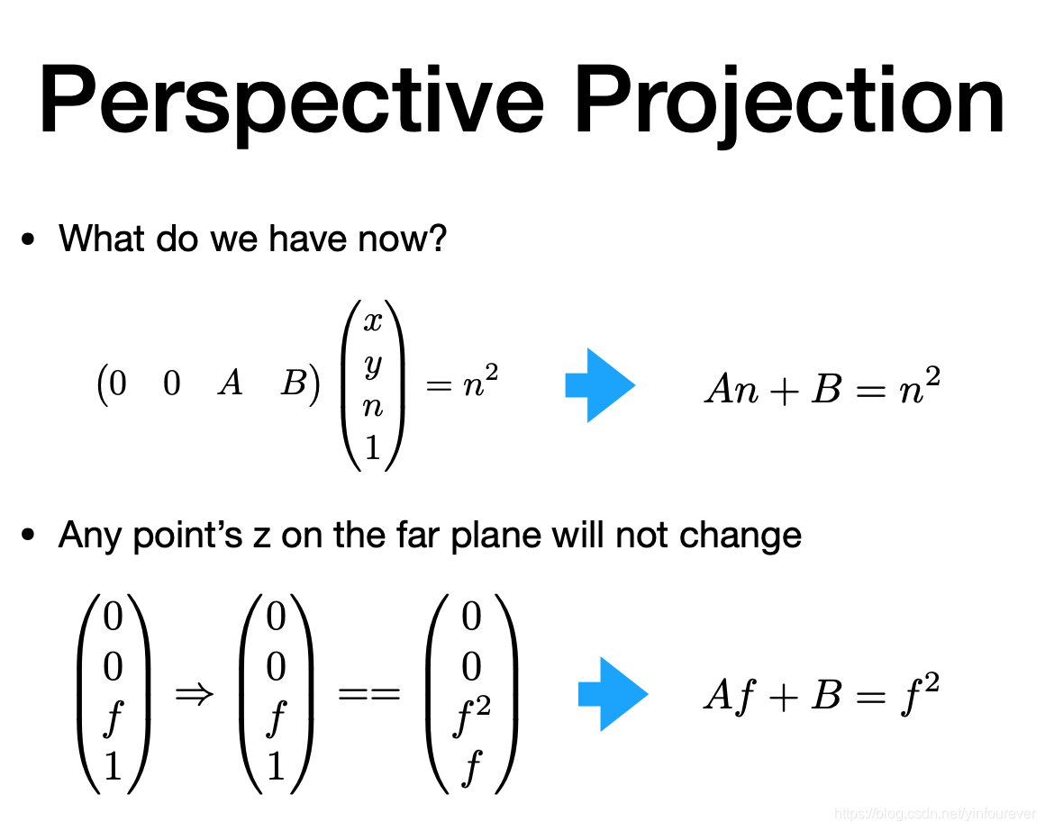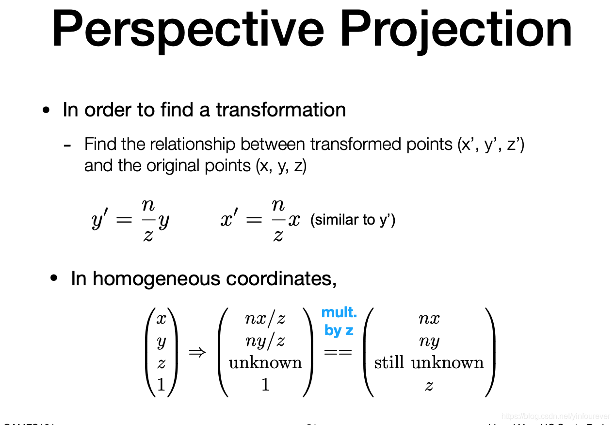 之前的运算中可以看到利用其次坐标,进行了乘z的操作来消除z对矩阵的影响,这也是为什么在渲染管线中存在透视除法这个操作。
