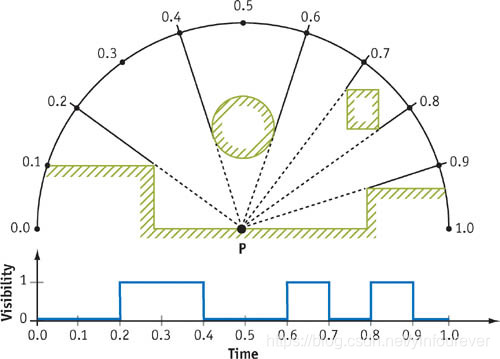 这章介绍了一种渲染软阴影的技术,称为遮挡区间映射(Occlusion Interval Maps),能够正确地在静态场景中渲染出光源沿着预定路径移动时产生的模糊阴影。之所以叫遮挡区间映射,是因为此算法使用纹理贴图来存储这种光源可见、而本身被遮挡的区间。