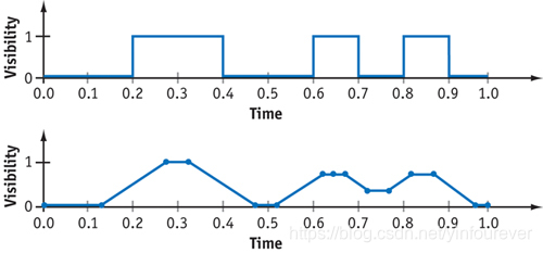 该文章采用的算法原理是将影子表达为一个可见度函数,当点在影子中是,它的值时0,当它被照明的时候,它的值是1.在渲染的时候,计算这个可见度函数,再讲结果乘以一个着色计算,得出最终的颜色值。具体看见度函数原理如一下两个图:第一个图是随时间便宜,可见性值的变化,第二个图是第一个图模糊后的结果。
