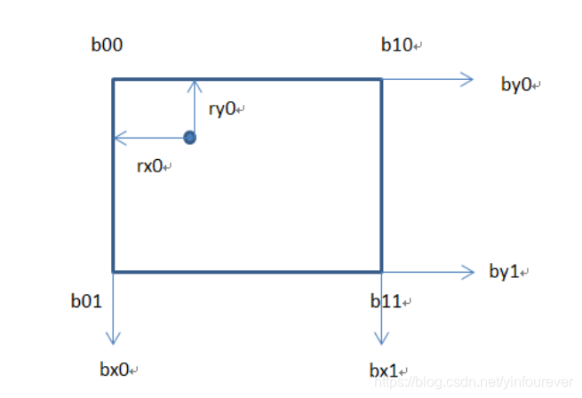 接下来做一个双线性插值,sx和sy就是第一步线性插值的系数,但是计算得到系数之后,我们还需要插值的起点和终点。他们的计算方法如下:
