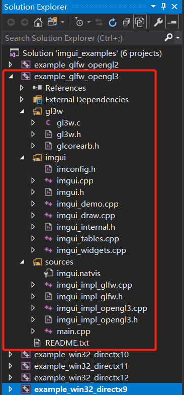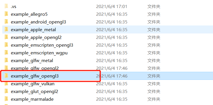 1. 首先查看使用VS打开的examples中的example_glfw_opengl3中需要哪些文件。