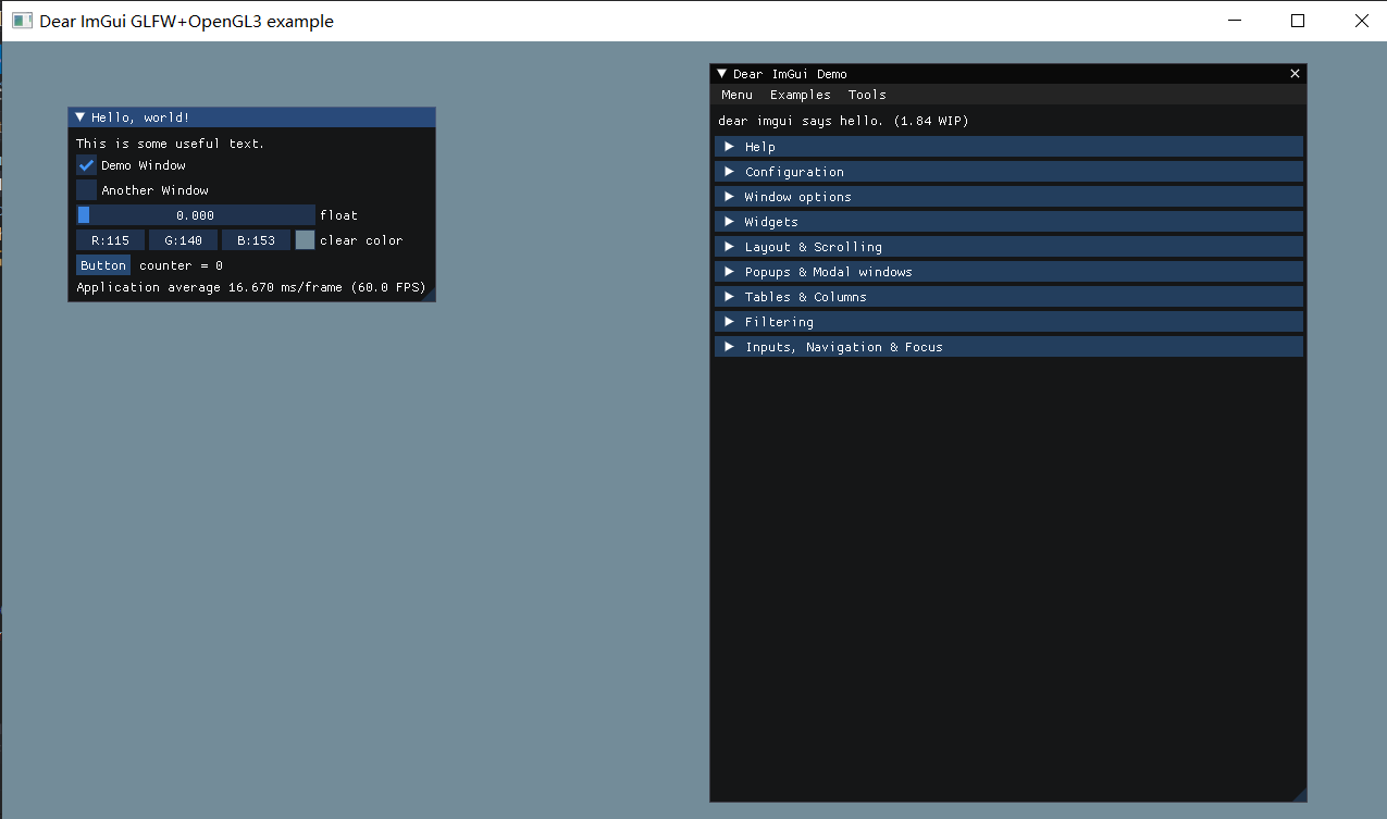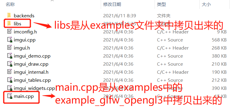 我选择的是glfw+opengl3这样的组合形式,也就是examples中的example_glfw_opengl3中的demo。在这个目录下有一个main.cpp是我们创建新工程需要的文件之一。