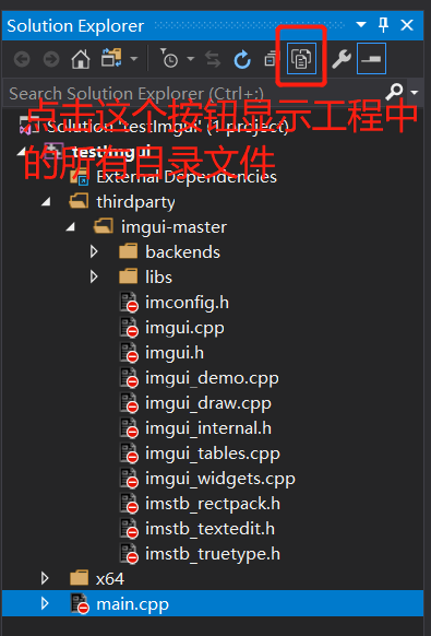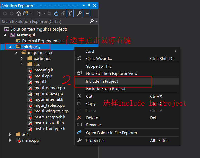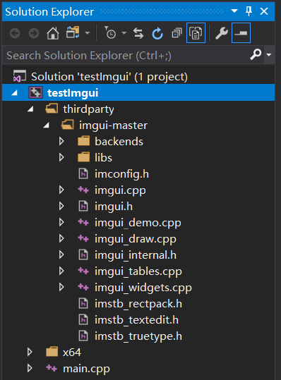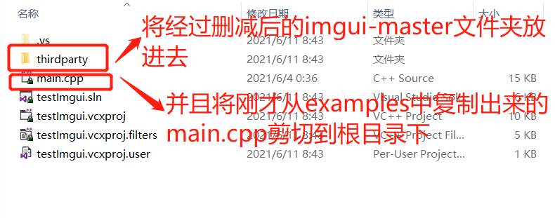 我们在VS上创建一个空工程,新创建一个thirdpaty文件夹,并且将刚才经过删减后的imgui-master文件夹放进去。并且将刚才从examples中复制出来的main.cpp剪切到工程的根目录下。