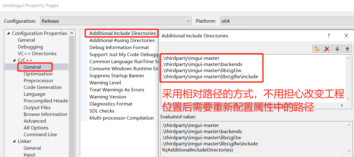 1. 设置"Additional Include Directories",这里设置了程序中所有使用#include的方式加入工程的的文件的路径