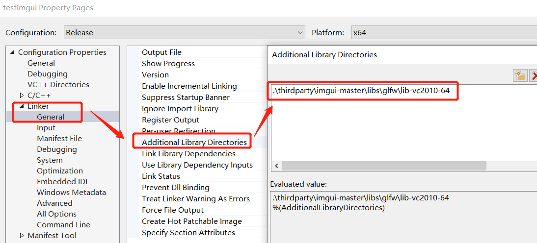 2. 设置“Additional Library Directory”,设置了程序需要的glfw路的路径