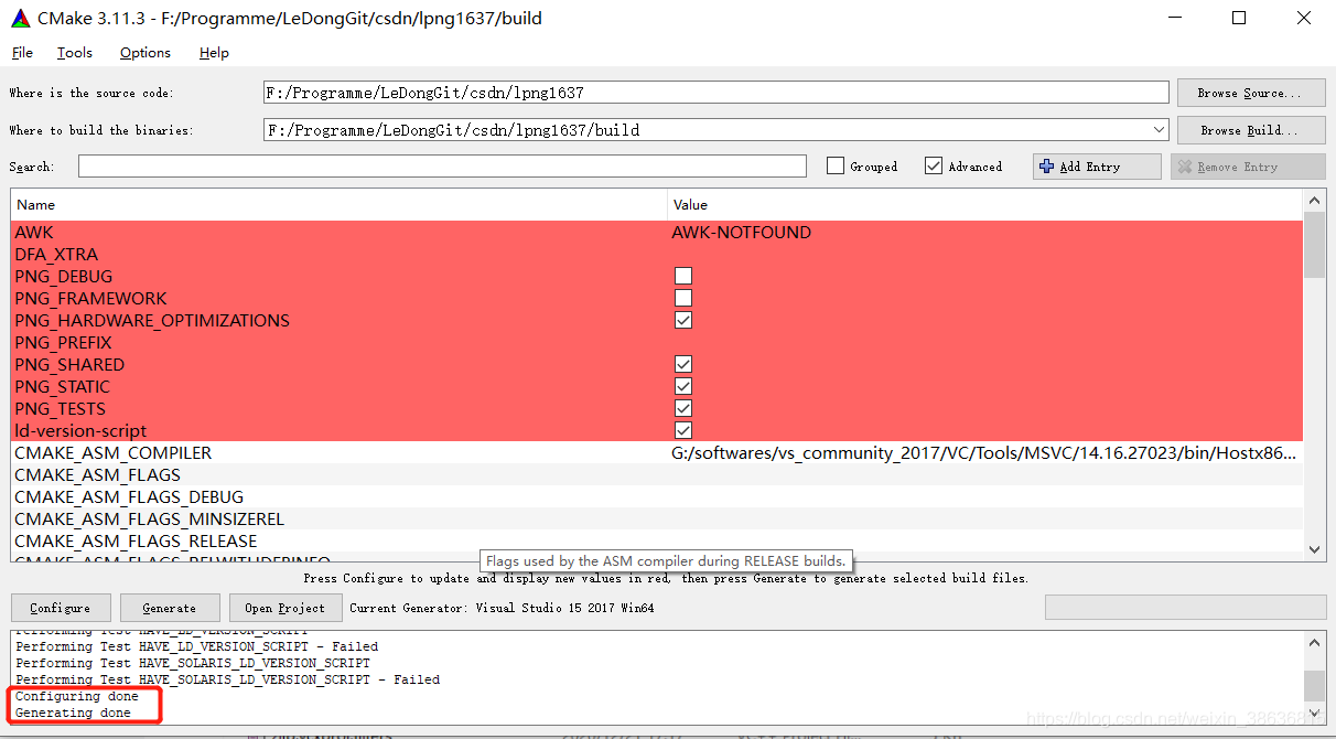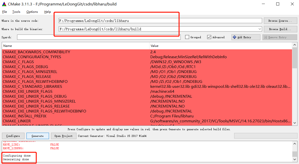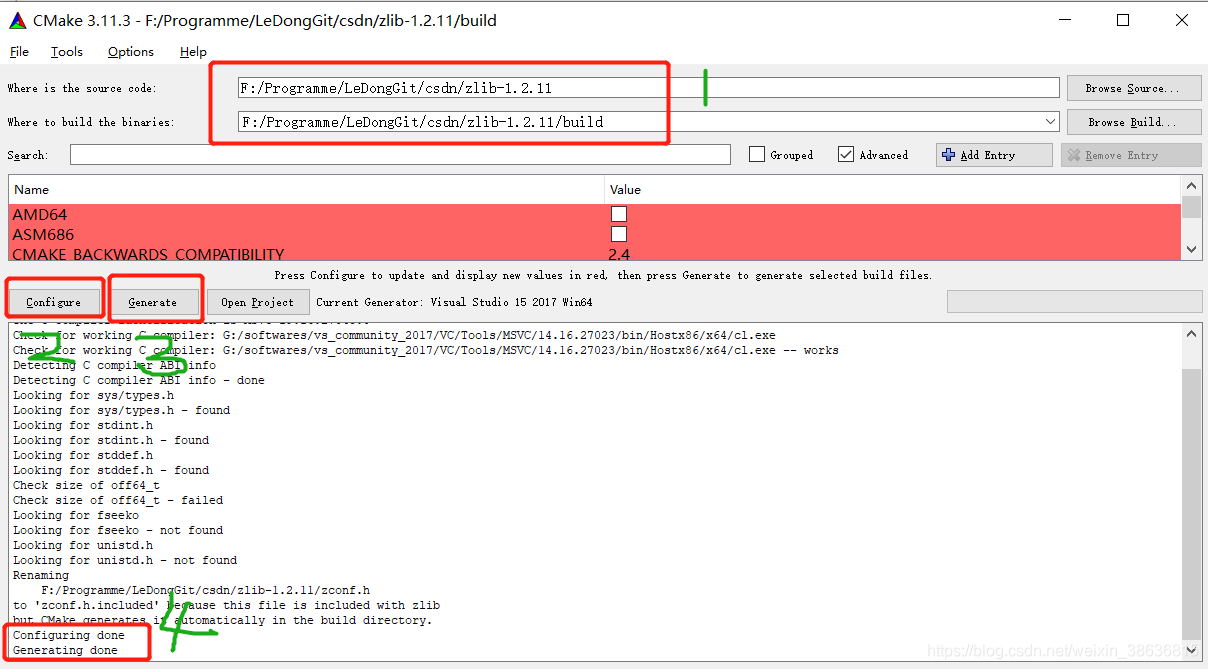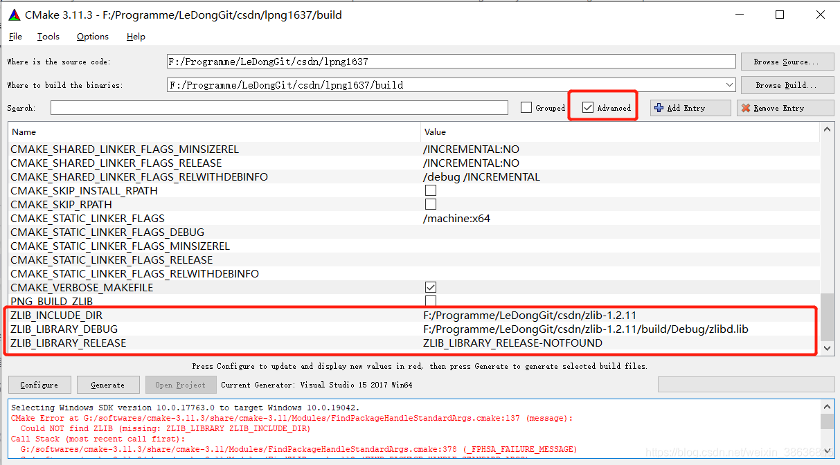 我们再第一步中已经编译好了zlib库,选择Abvanced,然后在下面设置ZLIB_INCLUDE_DIR和ZLIB_LIBRARY_RELEASE的路径,再次点击Configure和Generate。