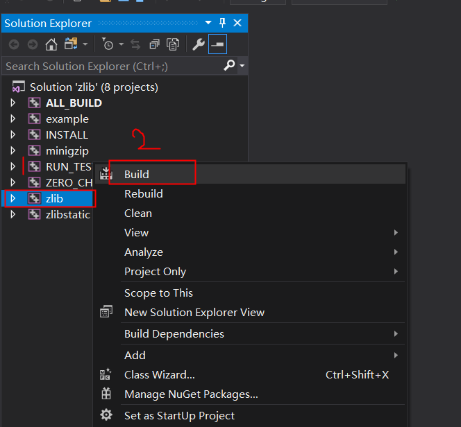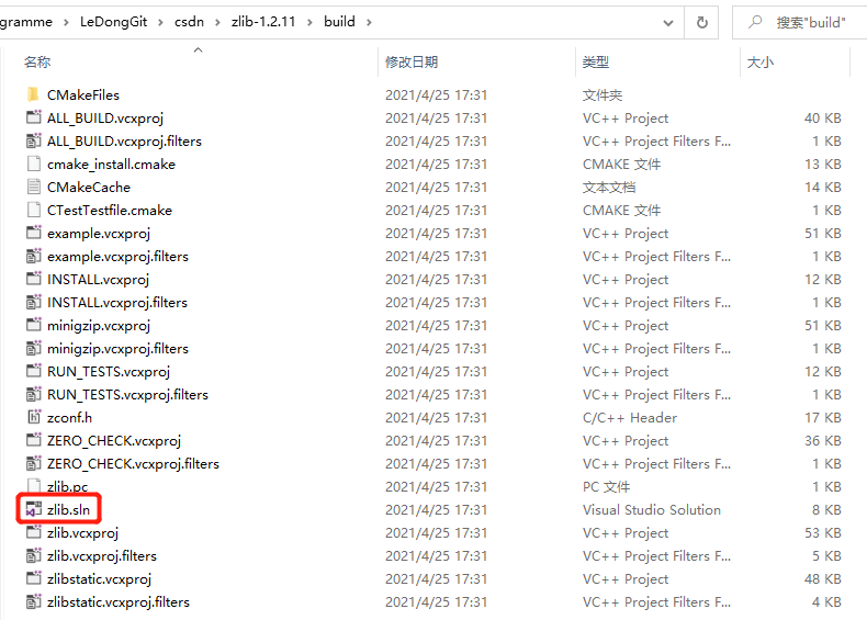 就是上面这些文件啦,接下来就是双击上面标注的这个zlib.sln文件,使用我的VS2017打开,然后开始编译