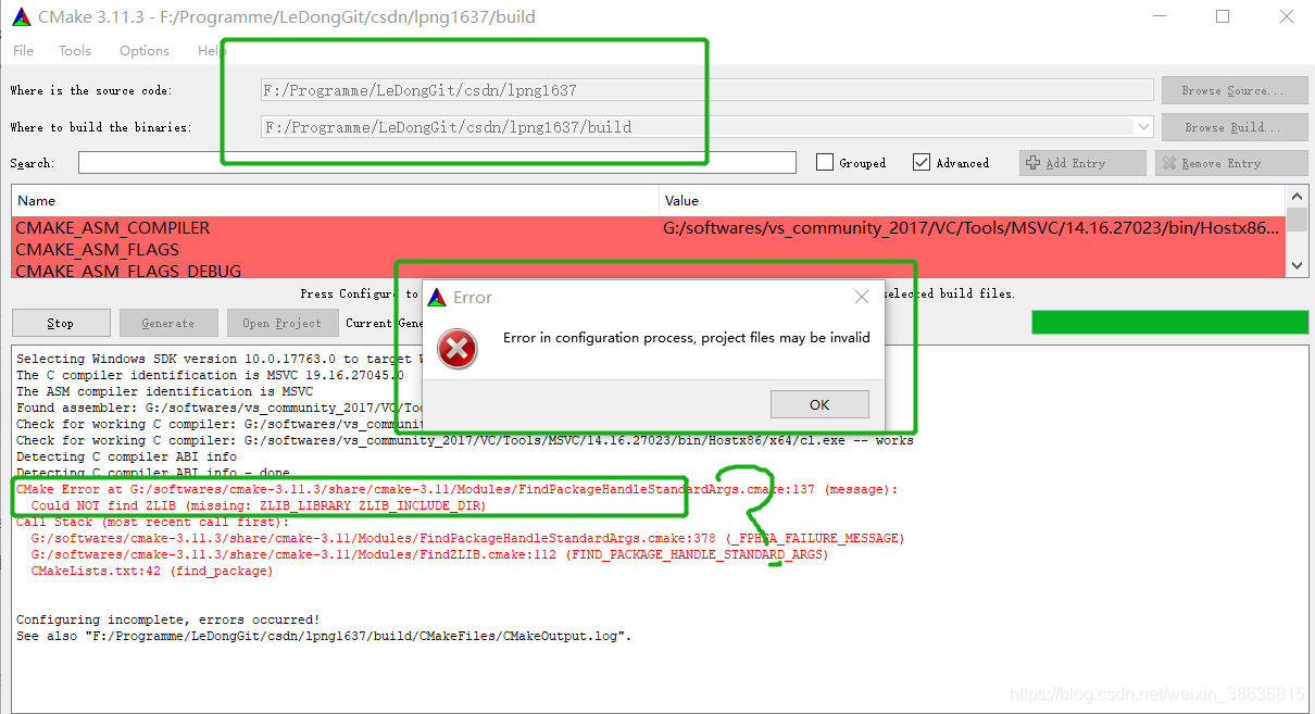首先也是要在lpng1637中新建一个build文件夹。然后打开cmake,设置lpng1637路径。点击Configure后弹出错误提示信息。可以看到是因为找不到ZLIB_INCLUDE_DIR和ZLIB_LIBRARY