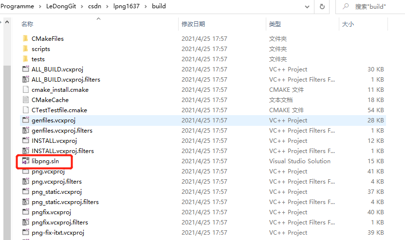 然后在lpng1637/build中创建一个zlib文件夹,然后将第二步中生成的zlibd.lib拷贝到zlib文件夹下。