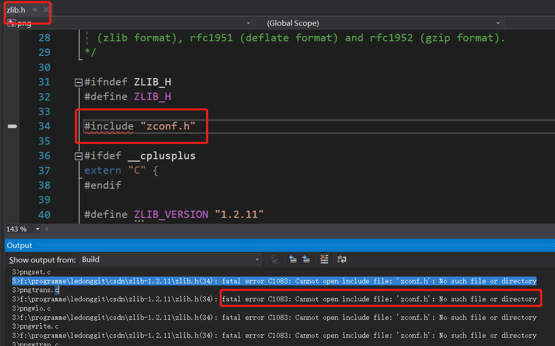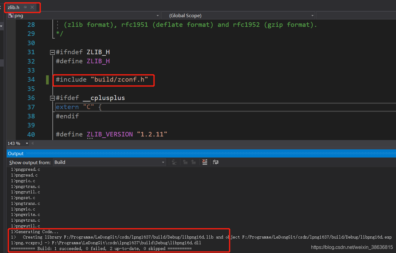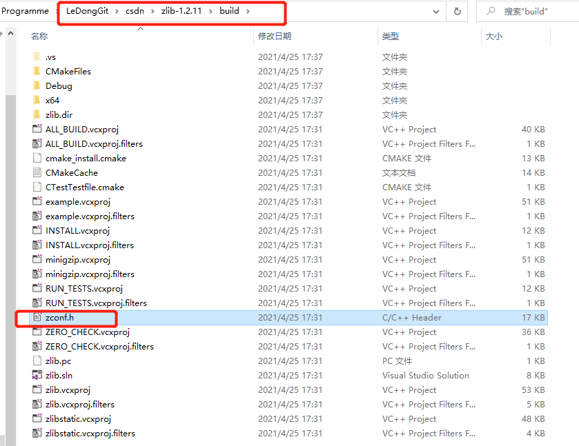 知道他们的相对位置后,我修改为#include "build/zconf.h",然后重新编译,编译成功。生成了libpng16d.lib