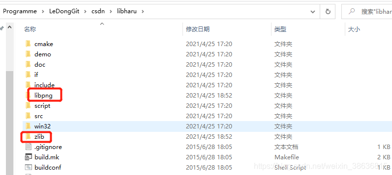 上面咱们已经成功编译了,zlib库和png库,同时生成了相应的lib文件,接下来首先在libharu目录下创建两个文件夹,分别命名为libpng和zlib。