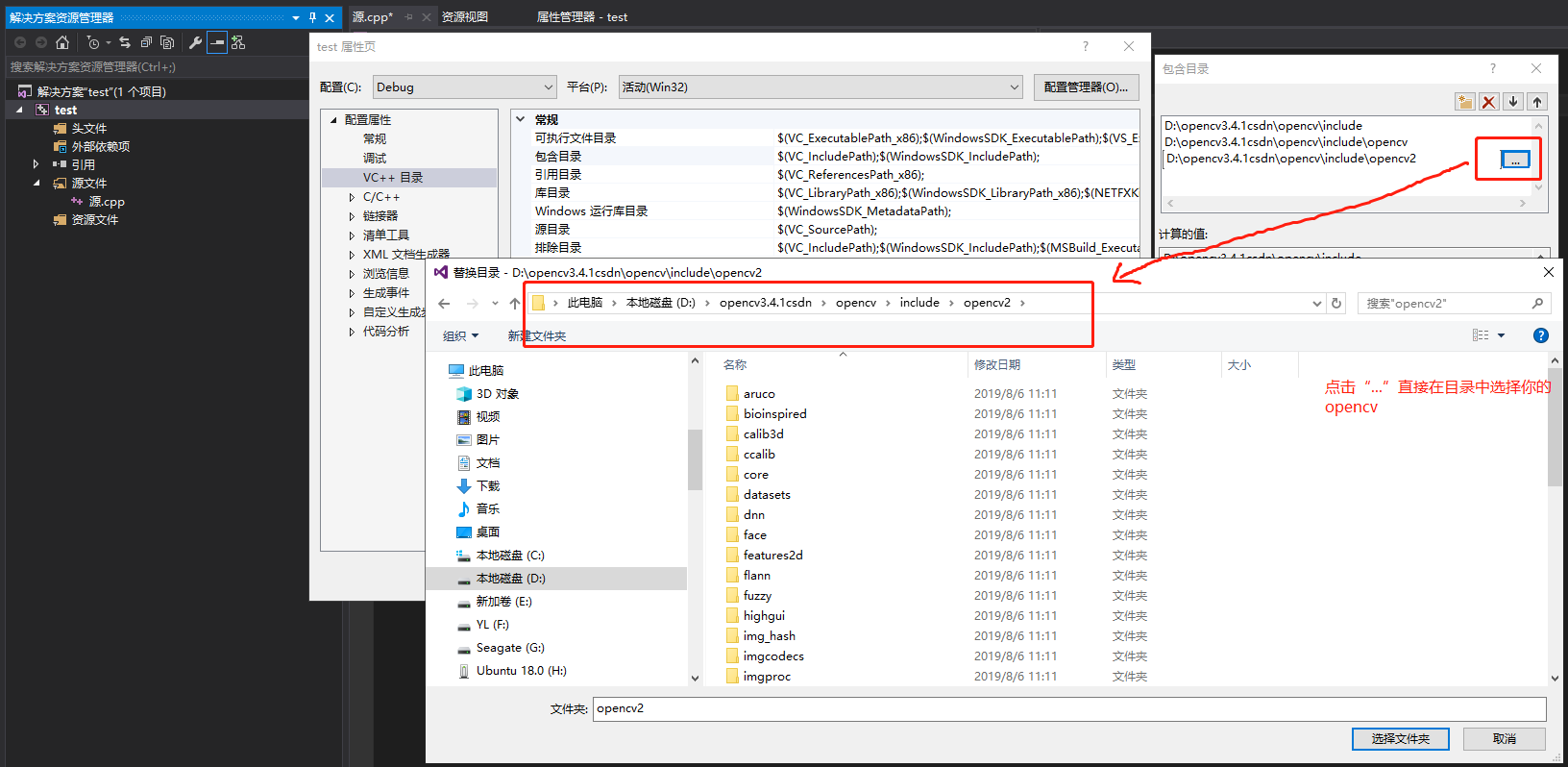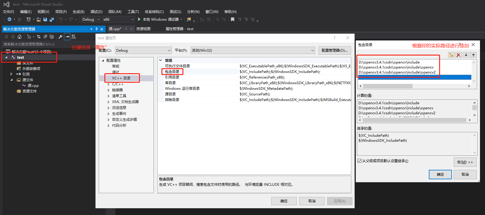 左键选中“项目”-->右键选择“属性”-->点击“VC++目录”-->点击“包含目录”右侧的“下三角”-->点击编辑-->然后添加关于opencv的include,opencv, opencv2目录