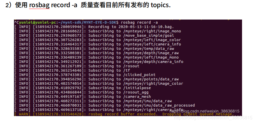 然后使用指令:rosbag record bagname.bag topics将我们需要的话题数据直接写入到bag文件,这里的话我们使用的指令为:rosbag record mynt_480p_rectified.bag /mynteye/left/image_mono /mynteye/right/image_mono /mynteye/imu/data_raw .