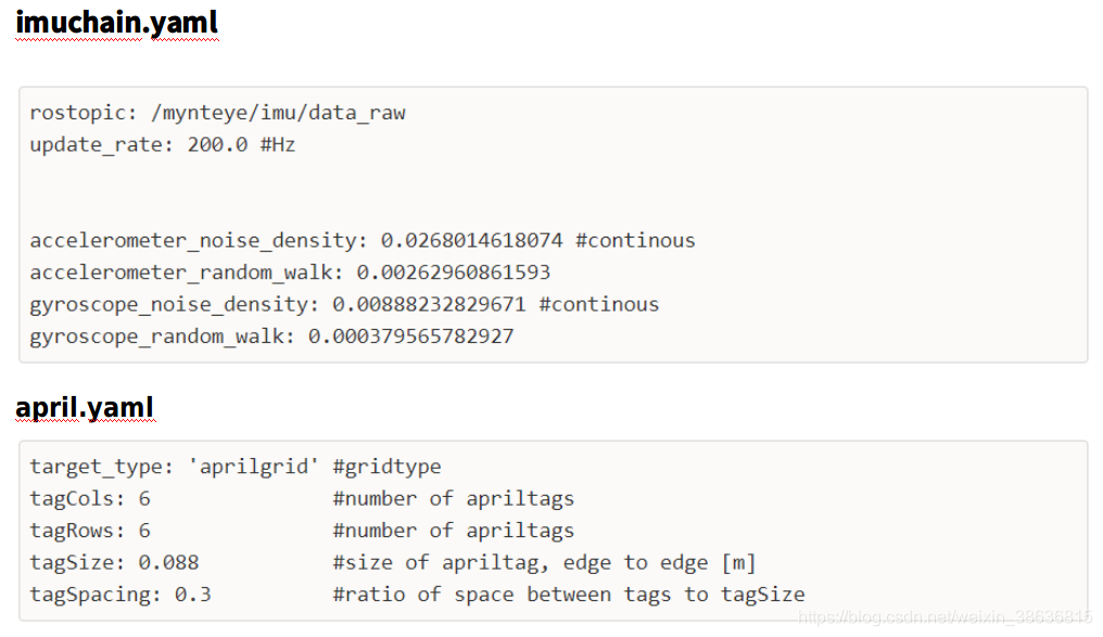 - 在使用kalibr工具开始标定之前,首先生成标定所需要的三个配置文件camchain.yaml, imuchain.yaml, april.yaml.