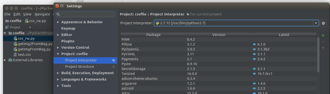 1. pycharm->file->settings->project:csvfile->project interpreter->