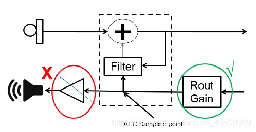 同时部分功放带有动态调节音量的功能,务必关闭此项功能,否则严重影响AEC效果;所有的动态调节都务必在AEC采样点之前进行,具体如下图示意: