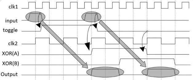 适用条件:输入脉冲间隔>=2*clk_slow。输入脉冲相隔过近,则慢时钟域的新脉冲也紧密相邻,结果是输出脉冲比一个时钟周期宽;如果太近,则无法检测到每一个脉冲。
