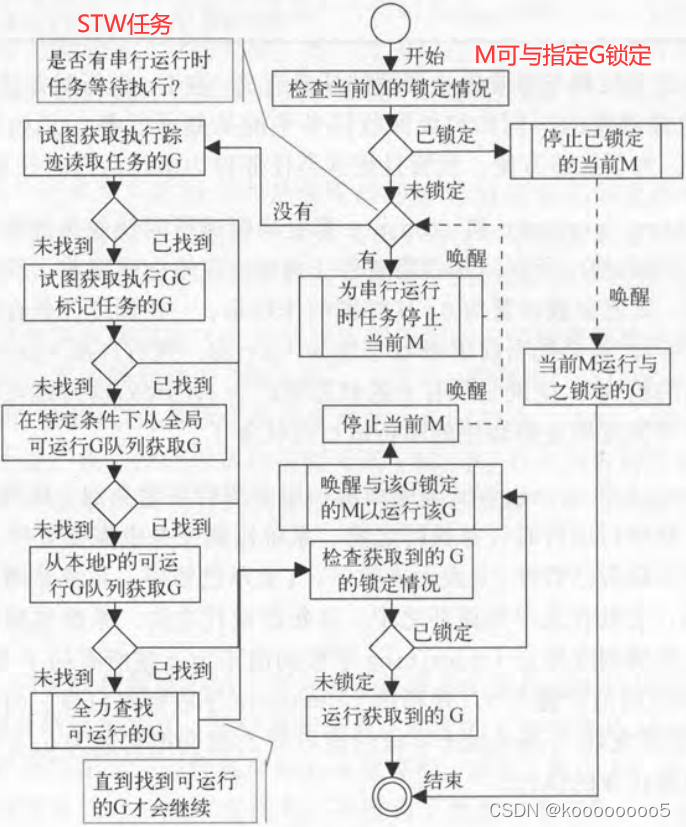 (1)调度器调度一个M会预先检查其是否与某个G锁定;如果有,则会调用stoplockedm解除当前M与P的关联并将P转手,并暂停当前M的执行。