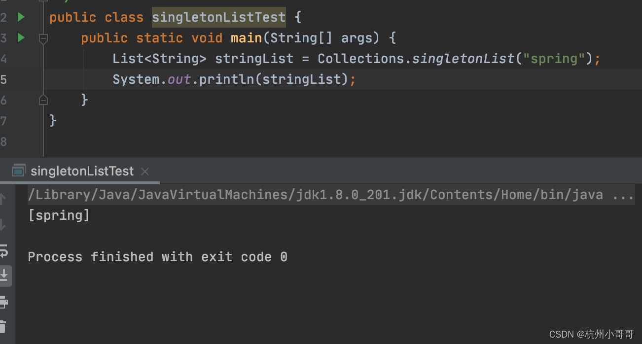 Collections.singletonList()返回的是不可变的集合,但是这个长度的集合只有1,可以减少内存空间。但是返回的值依然是Collections的内部实现类,同样没有add的方法,调用add,set方法会报错