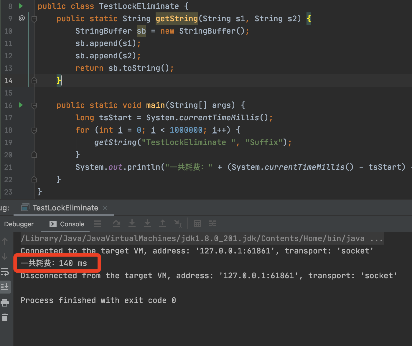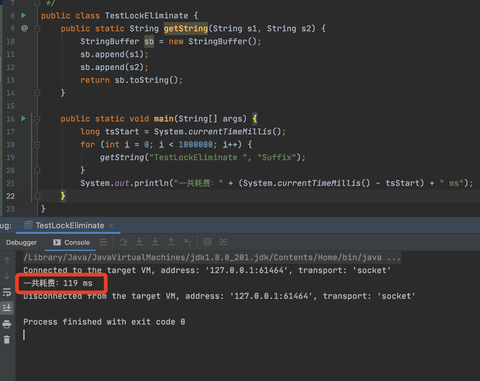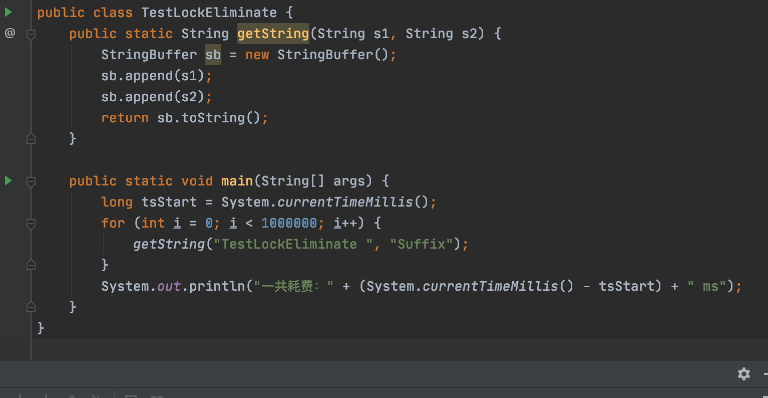 public class TestLockEliminate {public static String getString(String s1, String s2) {StringBuffer sb = new StringBuffer();sb.append(s1);sb.append(s2);return sb.toString();}public static void main(String[] args) {long tsStart = System.currentTimeMillis();for (int i = 0; i < 1000000; i++) {getString("TestLockEliminate ", "Suffix");}System.out.println("一共耗费:" + (System.currentTimeMillis() - tsStart) + " ms");}